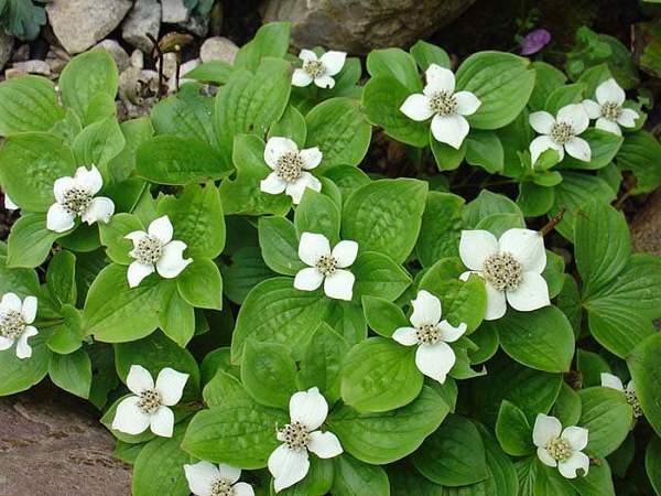 Дерен канадский. Почвопокровное растение, стелющийся кустарник, образующий эффектные ковры, листья гладкие, длиной 3-8 см, цветки мелкие, цветёт в начале июня, плоды ярко-красные, предпочитает слегка кислую, проницаемую и влажную плодородную почву, используется для посадок под кронами деревьев.