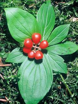 Дерен канадский. Почвопокровное растение, стелющийся кустарник, образующий эффектные ковры, листья гладкие, длиной 3-8 см, цветки мелкие, цветёт в начале июня, плоды ярко-красные, предпочитает слегка кислую, проницаемую и влажную плодородную почву, используется для посадок под кронами деревьев.