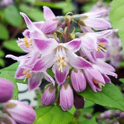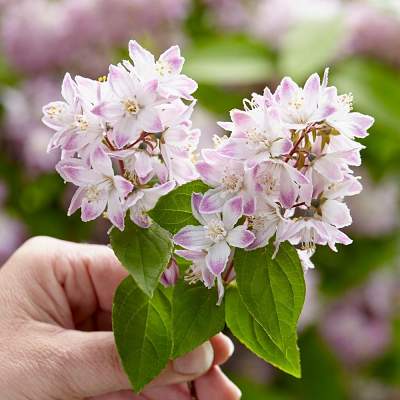 Дейция Raspberry Sundae (Распберри Сандей). В первую очередь, стоит отметить, что этому сорту ставят зимостойкость - 29°С. Во-вторых, это очень компактный кустарник, который хорош даже в в контейнерах. Высота до 120 см, крона округлая, густая. Цветки пятилепестковые, бело-розовые. Цветение в мае-июне, продолжительное.