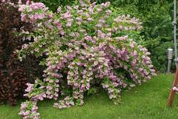 Дейция Strawberry Fields (Стобери Филдс). Кустарник до 150 см высотой, с густой кроной. Листья темно-зеленые, шершавые. Цветки малиново-розовые с белым центром, собраны в крупные соцветия. Цветет обильно в июне-июле.