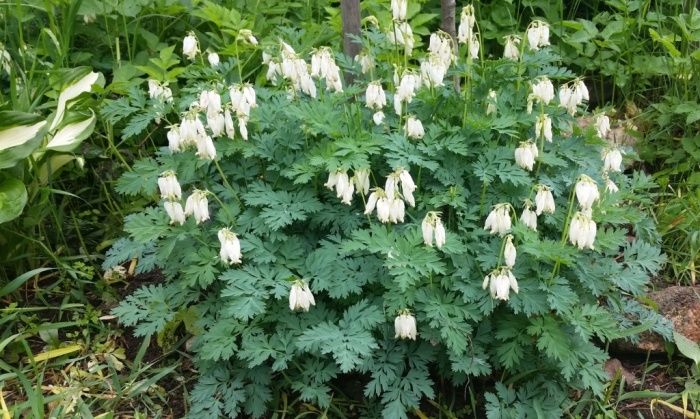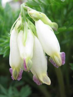 Дицентра Aurora (Аврора). Очаровательное травянистое растение с нежными серовато-зелеными листьями. Листья перисто-рассеченные, похожи на листья папоротника "венерин волос", образуют красивую аккуратную розетку. Корневище массивное, растение неприхотливо, но в первые годы лучше прикрыть на зиму лапником. Цветки белые, похожие на сердечки, с легкими фиолетовыми отсветами. Цветение в мае-июне.