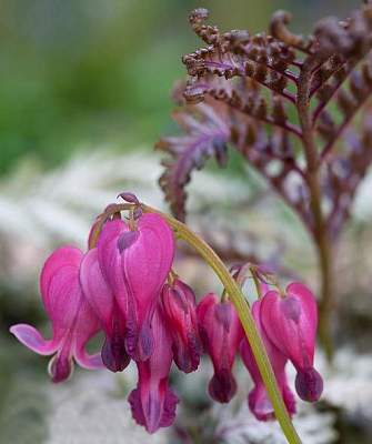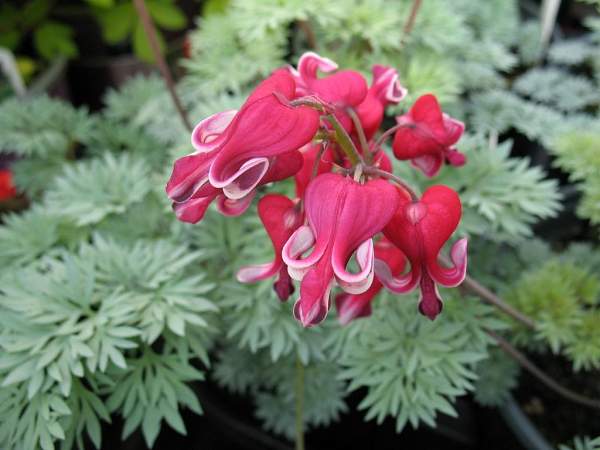 Дицентра King of Hearts (Кинг ов Хартс). Компактный многолетник с серо-зеленой резной листвой и кистями нежных светло-малиновых цветов. Предпочитает хорошо дренированные влажные почвы в полутени. В прохладном климате может цвести продолжительно, вплоть до сентября.