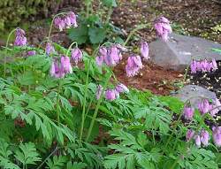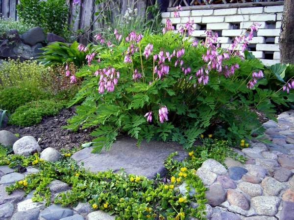Дицентра красивая. Невысокое корневищное почвопокровное растение с мясистым корневищем. Высота около 30 см. Образует розетку из красивых ажурных листьев. Листья на длинных черешках, нежные, пальчато-раздельные на мелкие доли, собраны в прикорневую розетку, зеленые, с сизоватым оттенком.