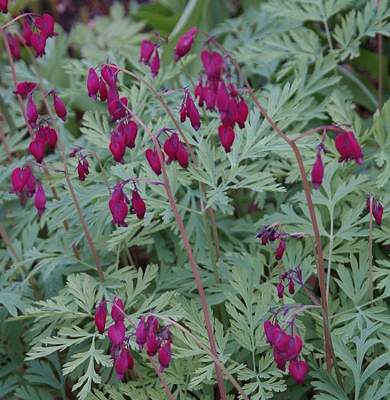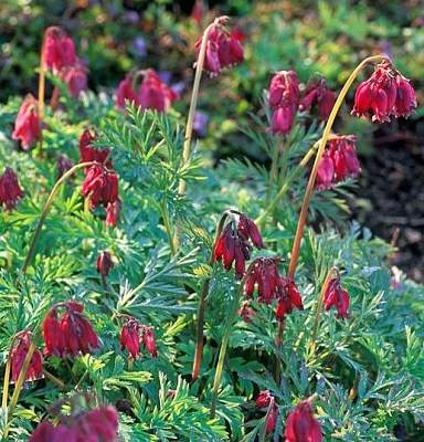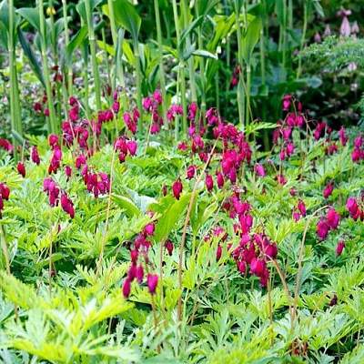 Дицентра красивая Bacchanal (Бэкканал). Неприхотлива, очаровательна, очень подходит для теневых цветников. Листья сизо-зеленые, перистые, многочисленные. Кустик аккуратный и привлекательный, округлый, хорошо разрастается. В цвету достигает 40-50 см. Цветоносы поднимаются над листьями.