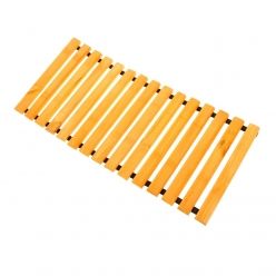 Изготовлен из массива сосны, обработана антисептическим составом. Элементы дорожки соединены резиновой лентой, что позволяет компактно скрутить ее для транспортировки и хранения.