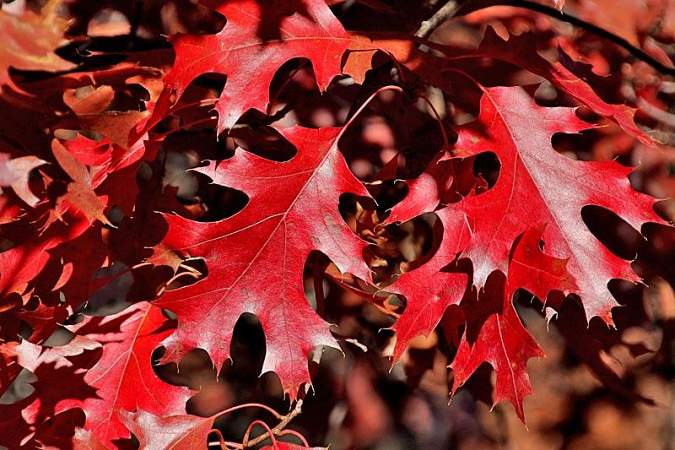 Дуб красный. Взрослое дерево достигает до 25 метров в высоту. Дерево стройное, с густой шатровидной кроной. Ствол покрыт тонкой, гладкой, серой корой, у старых деревьев кора растрескивается. Молодые побеги рыжевато-войлочные, однолетние — красно-бурые, гладкие. Листья глубоковыемчатые, тонкие, блестящие, до 15-25 см, с 4-5 заостренными лопастями с каждой стороны листа, при распускании красноватые, летом тёмно-зелёные, более светлые снизу, осенью, перед опадением, у молодых деревьев — шарлахово-красные, у старых — буровато-коричневые.