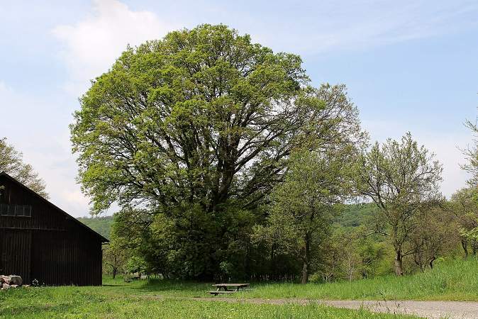 Дуб турецкий. Вырастает очень крупным, массивным и шикарным деревом. Отличается пышной, густой, шаровидной формой. Диаметр ствола может достигать 2 м. Листва крупная, зеленого окраса. Кора черноватого цвета и глубоко иссеченная. Плоды в виде желудей появляются летом и продолжительное время висят на ветвях, обильно покрывая огромную крону дерева. Живет 120-150 лет.