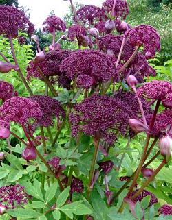 Дудник гигантский (Ангелика). Притягивающие взгляд темно красноватые стебли 120-140 см (до 180) высотой и темно-зеленая листва образуют куст 45-80 см в диаметре. Корни вертикальные, веретеновидные, несколько утолщенные, ветвящиеся.