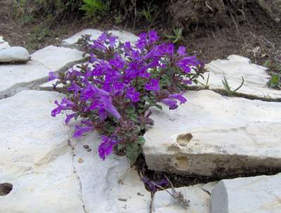 Acinos alpinus. Душевка альпийская (горный тимьян). Почвопокровный многолетник. Листья цельные, блестящие, ароматные. Цветочки фиолетовые, собраны в колосовидное соцветие. Цветет продолжительно — с мая по сентябрь. Высота покрова около 7 см.