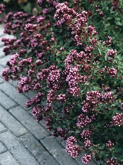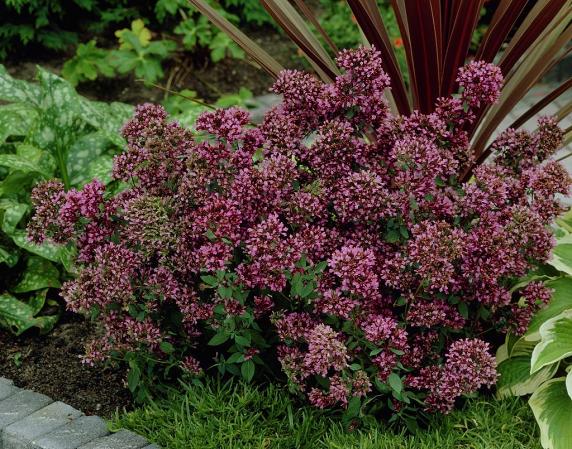 Душица Herrenhausen (Херренхаузен). Цветки розовато-фиолетовые, мелкие, с характерной темно-пурпурной чашечкой. Листья имеют пряный аромат, темно-зеленые, расположены на почти черных волокнистых стеблях, что придает растению особую прелесть во время цветения с августа по сентябрь, куст компактный, высотой до 50 см.