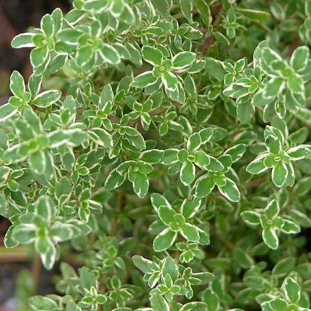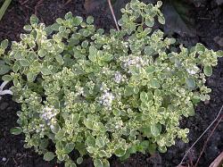 Душица обыкновенная Variegata (Вариегата). Листики зеленые с белой каймой, ароматные, цветки светло-розовые. Высота 20 см. Период цветения: июль-август. Хороша на клумбах, в декоративных огородах, вазонах.