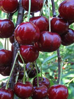 Дюк Кормилица (вишня-черешня). Уникальность сорта в его крупных, до 8 г весом, темно-вишневых ягодах с плотной, кроваво-красной, сочной, аппетитной, сладкой мякотью и характерным, тонким, нежным ароматом.