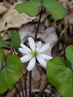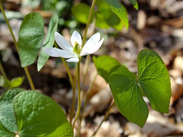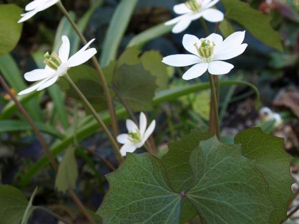 Джефферсония двулистная. Взрослое растение достигает 35 см в высоту. Цветет в середине — второй половине мая, когда листья еще не полностью сформированы. Цветки беловатые, небольшие, с восемью лепестками. Цветет недолго, около недели.