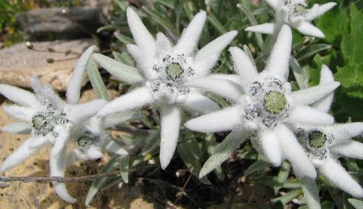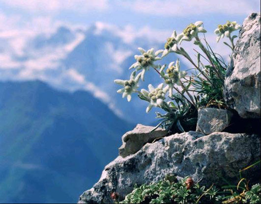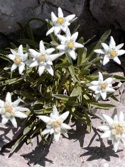 Эдельвейс альпийский. Слегка изогнутые стебли образуют низкие кустики до 25 см высотой. Ланцетные листья собраны в прикорневую розетку. Все растение сильно опушено, благодаря чему имеет светло-серебристый цвет. Цветки белые, собраны в мелкие корзинки, которые в свою очередь образуют небольшие щитки, окруженные декоративными, серовато-серебристыми листьями. Цветет в июле 20-25 дней. Плод — семянка с летучкой.