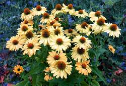 Эхинацея Aloha (Алоха). Цветки крупные, лепестки желто-бежевые, серединка ярко-оранжевая. Куст высотой до 55 см. Диаметр до 50 см.