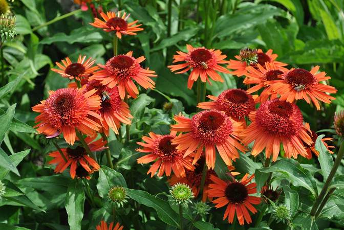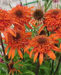 Эхинацея Carrot Cake (Кэррот Кейк). Цветы крупные, махровые, оранжевые с коричневато-оранжевым глазком. Цветет долго и обильно с июля по сентябрь. Куст крепкий, высотой до 40 см. Сорт яркий и аккуратный.