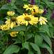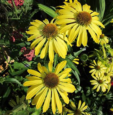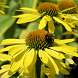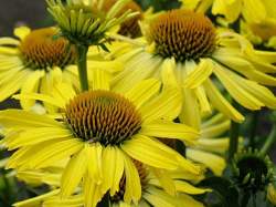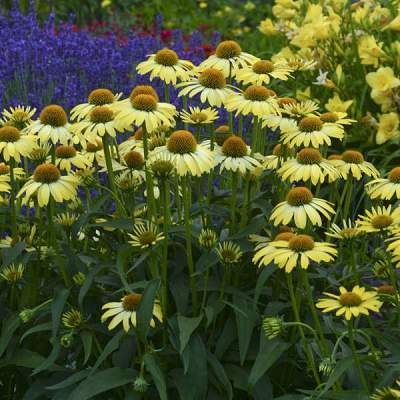 Эхинацея Cleopatra (Клеопатра). Вокруг коричнево-зеленой сердцевинки собран плотный круг тонких и длинных лепестков ярко-желтого цвета, который у основания лепестка переходит в молочно-белый цвет. Благодаря этому цветки кажутся невероятно крупными, а необычная зелень — темная с болотным отливом — подчеркивает их красоту.