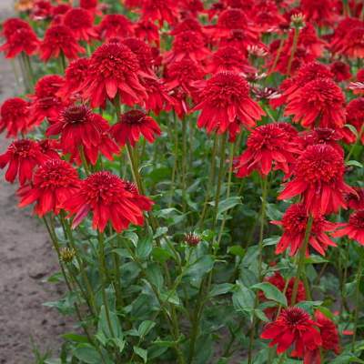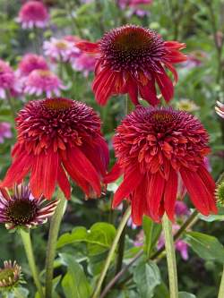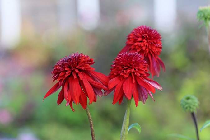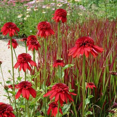 Эхинацея пурпурная Eccentric (Эксцентрик). Цветки большие, помпонные, яркие. При раскрытии имеют насыщенный красный цвет с оттенками фиолетового, постепенно переходя в огненно-оранжевые и алые тона. Цветки распускаются не одновременно, поэтому на растении наблюдается фейерверк различных оттенков. Кустик компактный, высотой 60 см. Сорт прекрасно подходит для срезки.