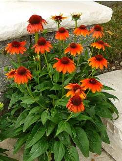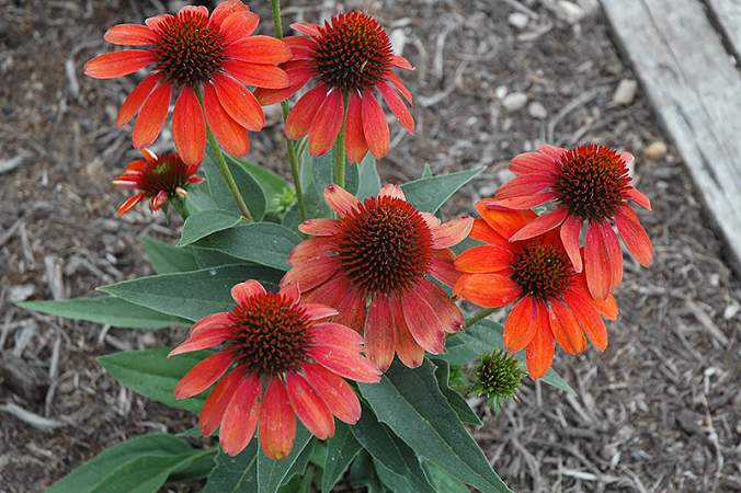 Эхинацея Flamenco Orange (Фламенко Оранж). Сорт из серии "Sombrero (SB)". Цветки яркие, оранжево-красные с коричневым конусом. Цветоносы хорошо разветвлённые, прочные, несут большое количество бутонов. Листья тёмно-зелёные. Растение компактное, высотой 55-60 см, идеально подходит для срезки и выращивания в контейнерах.
