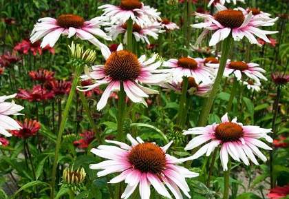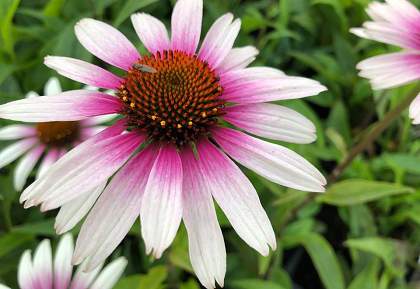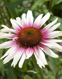 Эхинацея Funky White (Фанки Уайт). Цветы двухцветные белые с розовым. Прекрасно смотрится в цветочных композициях и как контейнерное растение. Предпочитает солнце или полутень. Цветет в конце лета, когда большинство многолетников уже отцветают.