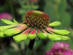 Эхинацея Green Envy (Грин Энви). Многолетнее травянистое растение высотой 80-100 см. Отличается крупными эффектными цветками. Листья овально-узкие, опушенные, зубчатые, с прожилками, зеленого цвета, иногда с пурпурным оттенком у основания. Цветы до 12 см в диаметре с лучевым расположением лепестков и шишковидной выступающей "щетинистой" сердцевиной появляются на пряморастущих жестких стеблях.