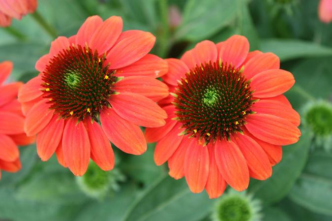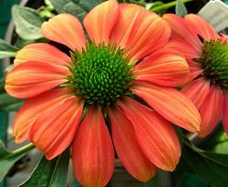 Эхинацея Hot Coral (Хот Корал). Сорт из серии "Sombrero (SB)". Цветки крупные, насыщенного кораллово-оранжевого цвета, очень яркие. Лепестки перекрывают друг друга и окружают большой зеленый центр.