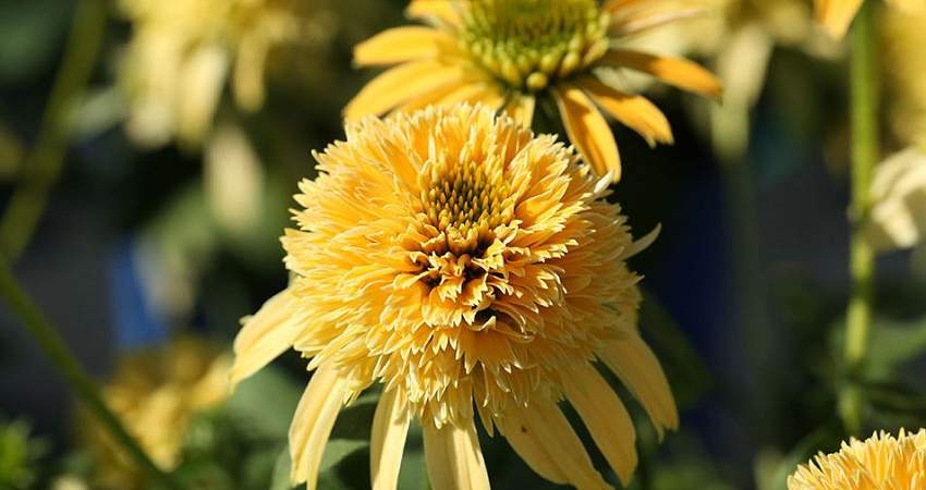 Эхинацея Lemon Cream (Лемон Крим). Цветки крупные, махровые, помпонные, в начале цветения жёлто-лимонные, затем кремовые с белым оттенком на концах лепестков. Цветение длительное. Листва тёмно-зелёная, устойчивая к заболеваниям. Цветоносы хорошо разветвлённые, прочные. Высота 55-60 см.