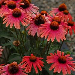 Эхинацея Mama Mia (Мама Миа). Многолетнее травянистое растение высотой 80-100 см. Отличается крупными эффектными цветками. Листья овально-узкие, опушенные, зубчатые, с прожилками, зеленого цвета, иногда с пурпурным оттенком у основания. Цветы до 12 см в диаметре с лучевым расположением лепестков и шишковидной выступающей "щетинистой" сердцевиной появляются на пряморастущих жестких стеблях.
