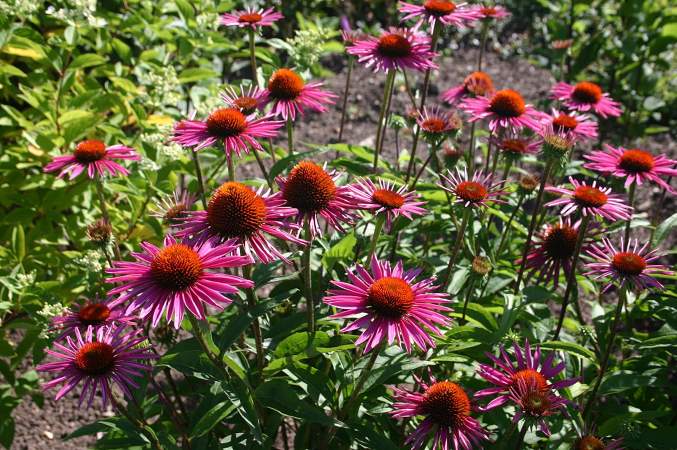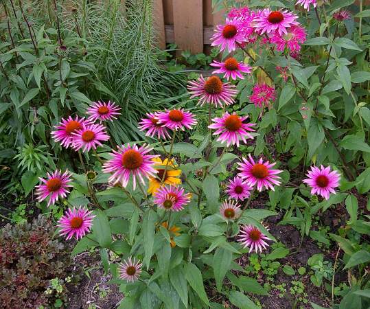 Эхинацея Pica Bella (Пика Белла). Отличается крупными эффектными цветками. Листья овально-узкие, опушенные, зубчатые, с прожилками, зеленого цвета, иногда с пурпурным оттенком у основания. Цветы до 12 см в диаметре с лучевым расположением лепестков и шишковидной выступающей "щетинистой" сердцевиной появляются на пряморастущих жестких стеблях.