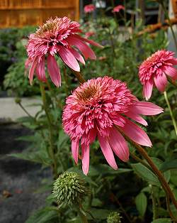 Эхинацея Razzmatazz (Разматаз). Полностью махровые цветы с однослойной юбочкой понизу. Цвет приглушенно розовый. Предпочитает богатые почвы, хорошо растет на солнце. Один из первых махровых сортов эхинацеи, популярный у цветоводов.