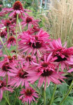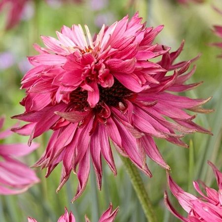 Эхинацея Red Baron (Рэд Барон). Плотный компактный куст высотой до 100 см. Стебли и листья шершавые. Корзинки 15 см в диаметре. Язычковые цветки пурпурно-розовые, трубчатые – коричнево-красноватые. Цветет с июля по сентябрь.