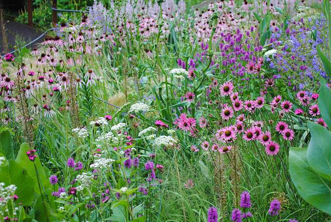 Эхинацея Rocky Top Hybids (Роки Топ Хайбридз) с эремурусами, котовником, прунеллой, стахисом и другими луговыми растениями.