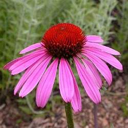 Эхинацея Rubinstern (Рубинштерн) — это многолетнее растение с красивыми пурпурными соцветиями. 80 см в высоту. Цветет продолжительно. Цветки диаметром до 12 см с очень выпуклой жесткой серединой красновато-коричневого цвета и лиловыми нежными лепестками снизу.