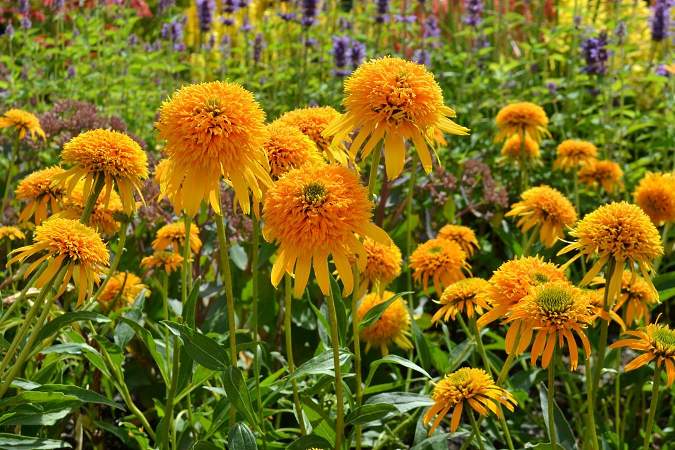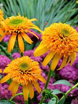 Эхинацея Secret Glow (Сикрет Глоу). Отличается необычной окраской и большим количеством цветков (в среднем 35 цветков на растении первого года цветения). Цветки махровые, помпонного типа, оранжево-жёлтые, диаметром 7-8 см. Центр конуса зелёный. Высота 65 см, ширина 60 см.