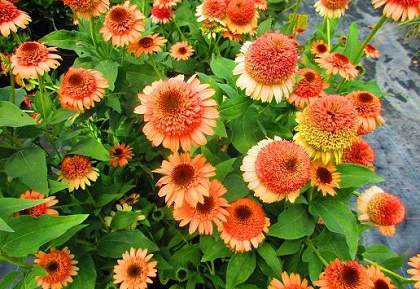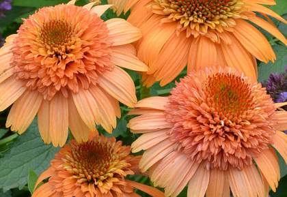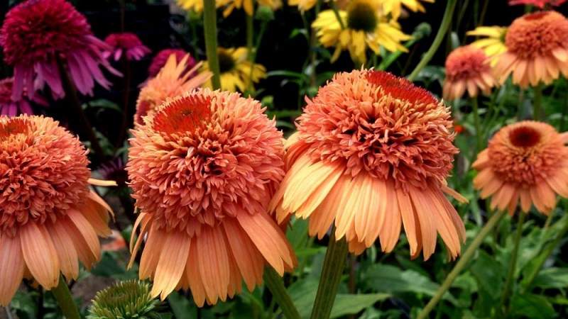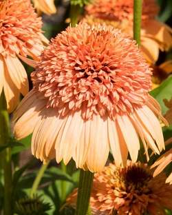 Эхинацея Supreme Cantaloupe (Суприм Канталуп). Сорт с нежно-абрикосовыми цветами. Краевые лепестки более длинные, серединка махровая и выпуклая, более темного цвета. Цветет обильно с июля по сентябрь. Привлекает бабочек и пчел. Высота 80 см.