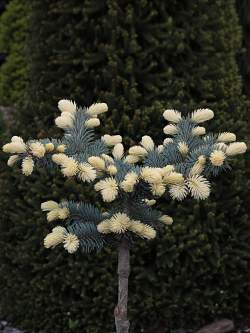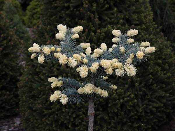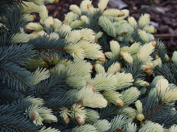 Ель колючая Bialobok (Бялобок, Белобок). Уникальный польский сорт, признан настоящим шедевром. Хвоя серебристо-синевато-зеленая. Прирост кремово-белый, красиво контрастирует со зрелой хвоей.