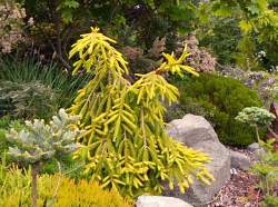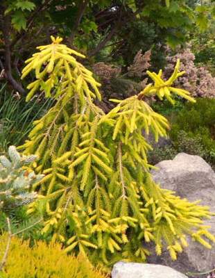 Молодые приросты цвета лайма, затем на солнце светлеют до золотого и в течение года больше не меняют окраску. Ель стоит яркая круглый год. Прирост 10 см в год. Неприхотлива, растет на любых почвах, морозостойка.