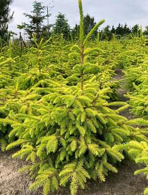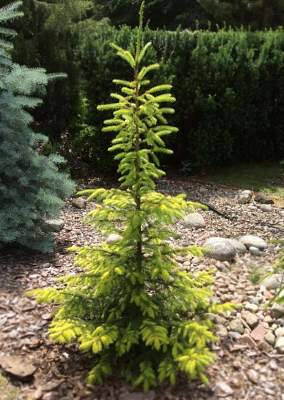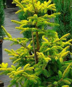 Ель сербская Golden Rain (Голден Рейн). Отличный акцент для небольших и средних по размерам садов. Форма узкоколонновидная, как у видовой ели. Высота взрослого растения около 4 м. Хвоя светло-салатовая, желтая. Полностью устойчива к весенним ожогам. Прирост эффектный, ярко-желтый. Годовой прирост около 15 см. Легко формировать.