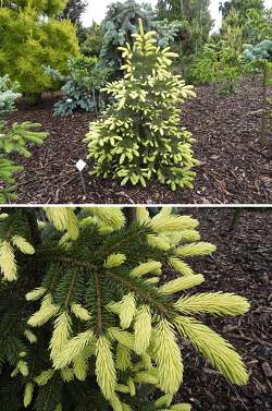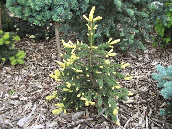 Ель шероховатая Kornik (Корник). Голубая ель с ярко-желтовато-белым приростом. Форма классическая конусовидная. К 10 годам вырастает до 2,5 м. Декоративное растение, которое станет звездой сада.