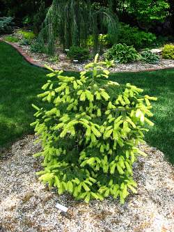 Ель обыкновенная Perry's Gold (Перрис Голд). Плотный хвойный кустарник конической формы. Высота 1,2-1,8 м в 10 лет, годовой прирост 5-10 см. Молодые ярко-желтые побеги постепенно становятся темно-зелеными. Необыкновенный контраст старых игл бриллиантовой зелени с молодыми ярко-жёлтыми приростами.