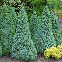 Ель канадская Сандерс Блю. Очень декоративный, относительно новый, но стремительно набирающий популярность сорт. Аналог известного сорта Коника, но более компактный и с яркой сизо-голубой хвоей. Растет медленно и достигает к 10 годам 80 см в высоту. Побеги многочисленные, хвоя мягкая, молодые побеги имеют более свежий, насыщенный цвет, очень декоративны.