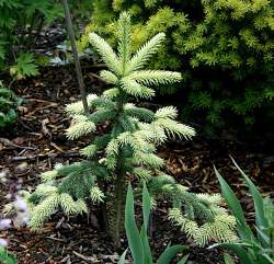 Ель сербская White Tip (Вайт Тип). Карликовая форма сербской ели с красивым белым приростом. Зрелая хвоя голубоватая. Ель имеет нерегулярный рост. За десять лет вырастает до 100-120 см. Очень декоративна. При посадке следует учитывать, что для этой ели желательно притенение в полуденные часы.