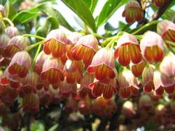Энкиантус колокольчатый. Листопадный кустарник из семейства вересковых, высота до 1,5 м. Ветви расположены мутовчато. Побеги красные. Листья эллиптические или обратно-яйцевидные, зеленые, осенью окрашивающиеся в сияющий, очень яркий огненно-красный цвет. Цветет обильно весной до распускания листьев. Цветки крупные, многочисленные, в верхушечных висячих щитковидных кистях, кремово-желтоватые с красными жилками или полностью красные.