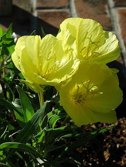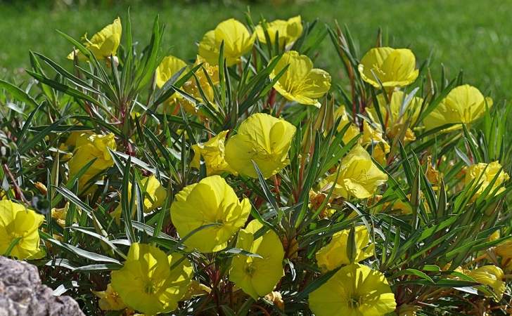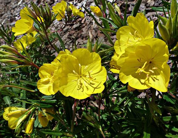 Энотера крупноплодная. Цветки диаметром 8-10 см, ярко-жёлтые. Габариты взрослого куста достигают 40 см в высоту и 30 см в ширину. Это необычное растение цветет на протяжении всего лета, но желтые цветочки раскрываются лишь в пасмурную погоду, а также по вечерам.