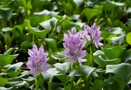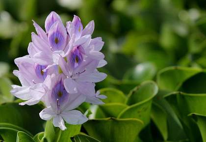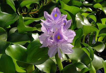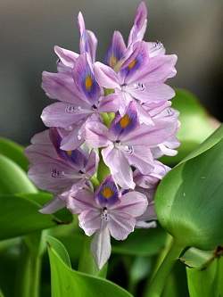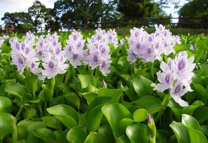 Эйхорния толстоножковая. В этом растении усматривают сходство с настоящим гиацинтом, поэтому и называют водным (или водяным гиацинтом). Водяной гиацинт – одно из привлекательных своей декоративностью растений, чаще его выращивают в прудах или садовых водоемах. Незабываемое впечатление эйхорния производит в период своего цветения. Цветы лилового, голубого или розового цвета с ярким темным пятном на верхнем лепестке цветут лишь один день.