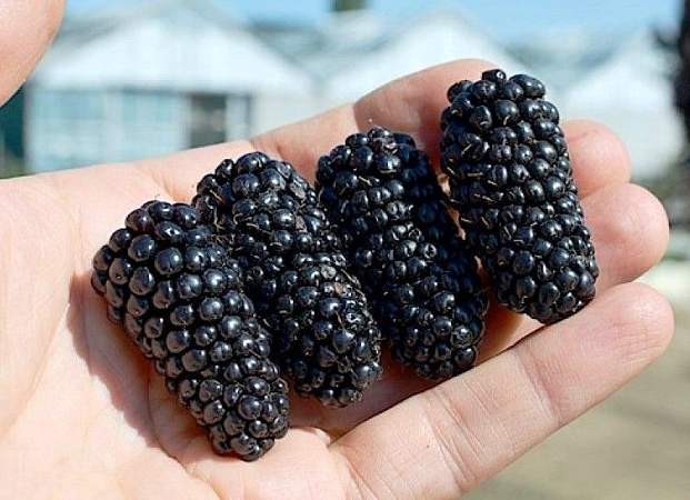 Ягоды насыщенно черного цвета, глянцевые, удлиненной формы, очень привлекательные внешне. Сладкая крупная ягода, достигающая в длину 6 см. Плоды универсальны: их можно употреблять свежими, консервировать, замораживать, использовать для приготовления джемов, мармелада и прочих десертов.