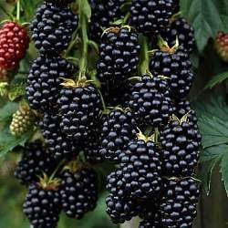Ежевика Thornfree (Торнфри). Ягоды крупные (до 5 грамм) черно-сизые с кисло-сладким вкусом. Урожай бывает в конце лета-начале осени, ягоды в крупных гроздях, созревают почти одновременно. Помимо урожайности к достоинствам сорта можно отнести декоративность, особенно в период цветения в июне, когда куст покрывается розовыми ароматными цветками. Полноценное обильное плодоношение начинается на 3-4 год жизни растения.