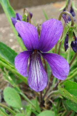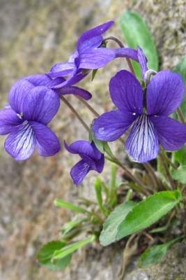 Цветки 2,5-2,6 см в диаметре, на длинных, опушенных цветоножках, превышающих длину листьев. Лепестки фиолетовые, с темными прожилками, широкие, обратнояйцевидные. Шпорец 4-5 мм длиной.