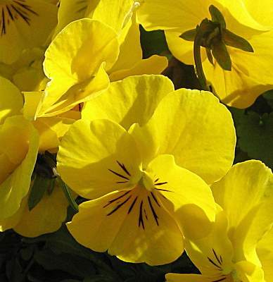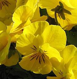 Фиалка рогатая Yellow Glance (Йеллоу Гланс). Цветки желтые. Типичный многолетник, но требует омолаживания путём деления или пересева. Часто даёт самосев. Цветёт очень долго и обильно, но со второй половины лета цветки становятся мельче. Срез многочисленных семенных коробочек продлевает и улучшает цветение. Высота кустиков может быть от 10 до 25 см.