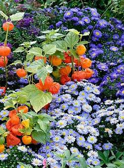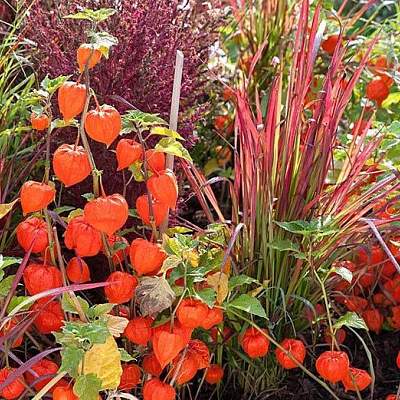 Физалис Franchetii (Франше). Оригинальный многолетник с декоративными оранжево-красными вздутыми чашечками, похожими на фонарики. Стебли угловато-изогнутые, на каждом из них образуется 10-15 "фонариков". Листья овальные. Цветки одиночные пазушные беловатые, диаметром до 3 см. Плод ягодообразный, ароматный, приятный на вкус, находится внутри разросшейся до 5-6 см чашечки.
